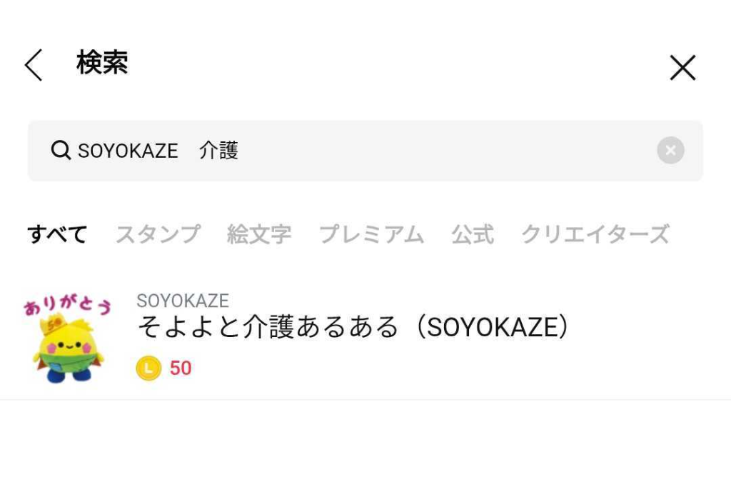 LINEスタンプを開き、「そよよ 介護」または「SOYOKAZE 介護」と検索してください。