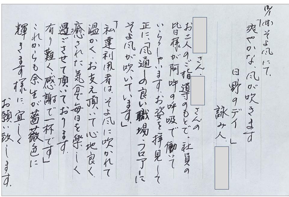 今回は、弊社代表の中川が「日野ケアセンターそよ風」へ施設訪問をした際に、デイサービスをご利用中のお客さまからいただいたお手紙をご紹介します。