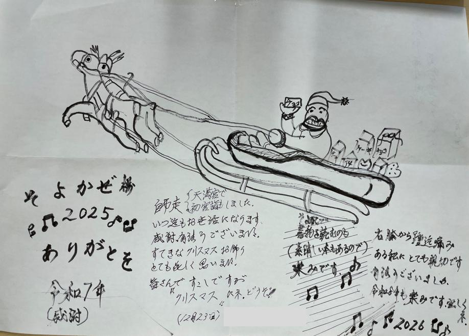 今回は、高知ケアセンターそよ風のデイサービスをご利用中のお客さまから、12月24日のクリスマスイブにプレゼントしていただいたかわいいイラストつきのお手紙をご紹介します。